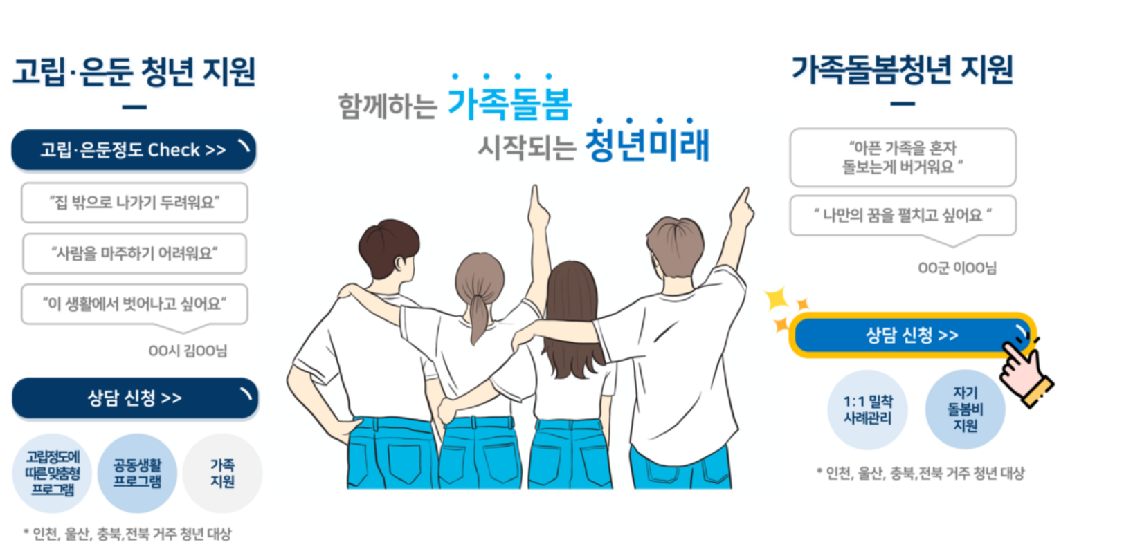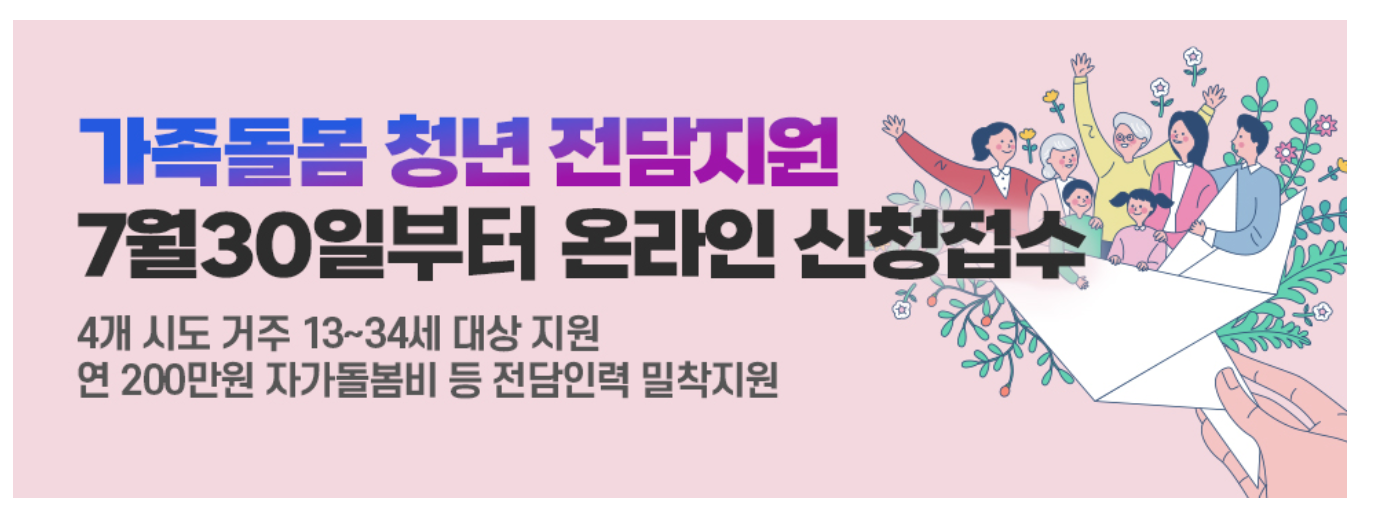 보건복지부에서는 인천,울산,충북,전북에 거주하는 13세부터 34세 이하의 가족 돌봄 청년들을 위해 전담지원 서비스를 전담인력 밀착지원합니다.